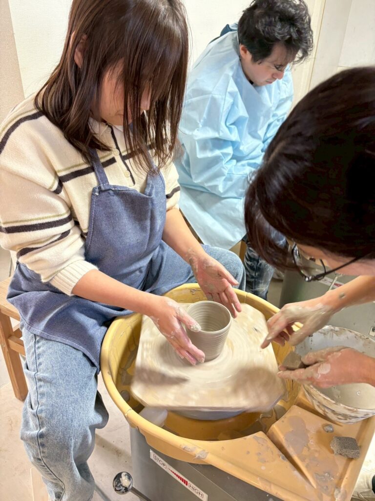 電動ろくろチームは、最初は回る台のスピードに戸惑いながらも、陶芸の先生が横で手を添えてサポートして下さり、少しずつ形が整っていく感覚を