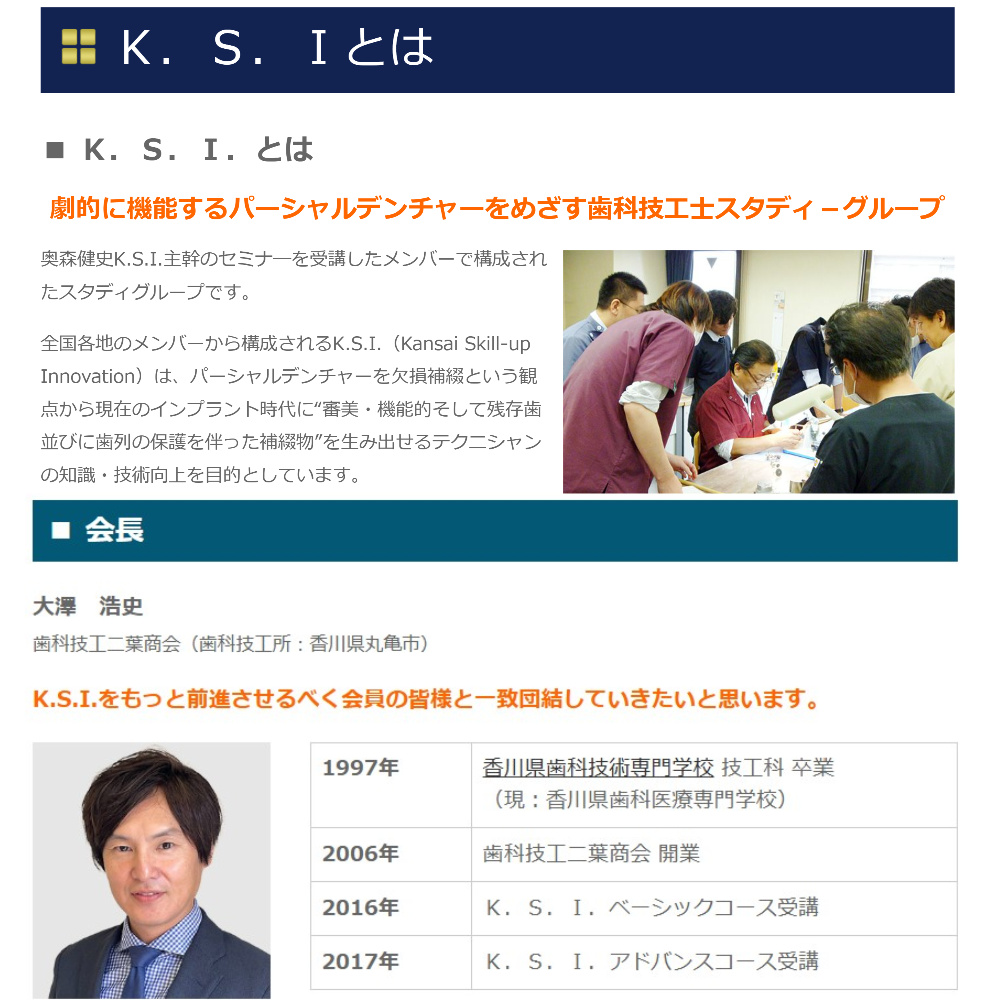 100名以上の義歯専門家で構成される全国的な技工士スタディーグループ「K.S.I」の会長を務める義歯のスペシャリスト。歯が残っている人にはこれ以上歯を失わせないことを、全て歯がない方にはできるだけ快適で多くのものが食べられる義歯造りを心掛けている。