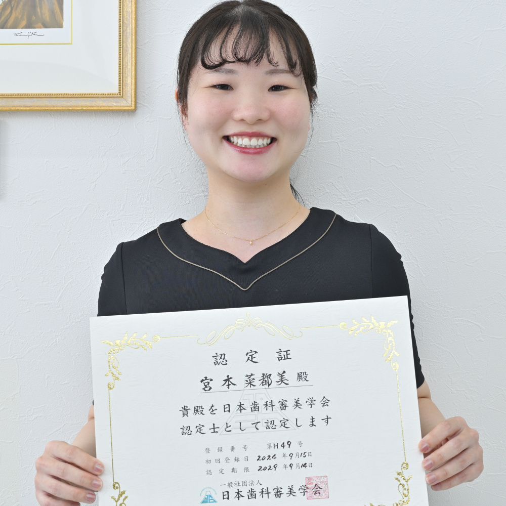 「歯科審美学とは、顎口腔系における形態美・色彩美・機能美の調和を図り、人々の幸福に貢献する歯科医療のための教育および学習に関する学問体系である」と定義し、追及する日本歯科審美学会から、その研鑽や発表を認められ、20人以上の審査官による認定試験を潜り抜け、四国で唯一(2024年現在)の認定士資格を獲得しました。 当医院では審美歯科治療も数多く行われており、その多くを担当しています。