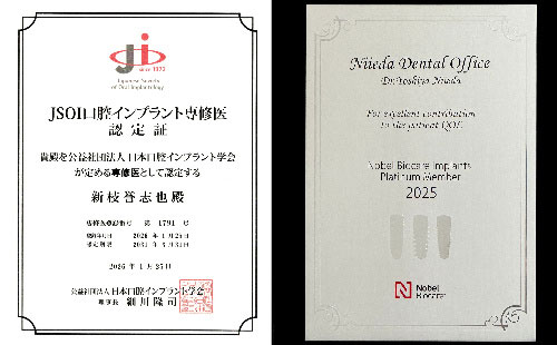 日本最大の歯科の学会、日本口腔インプラント学会にて、その技術、知識が評価され、「専修医」の資格を与えられました。