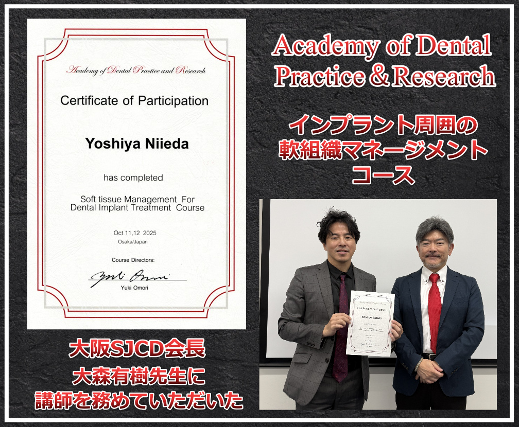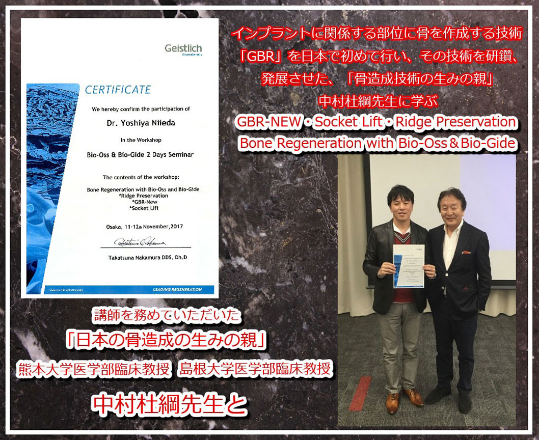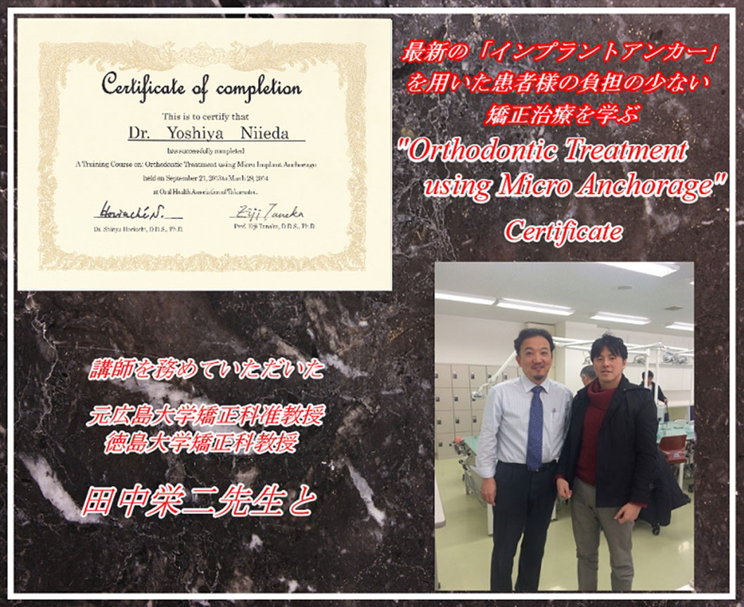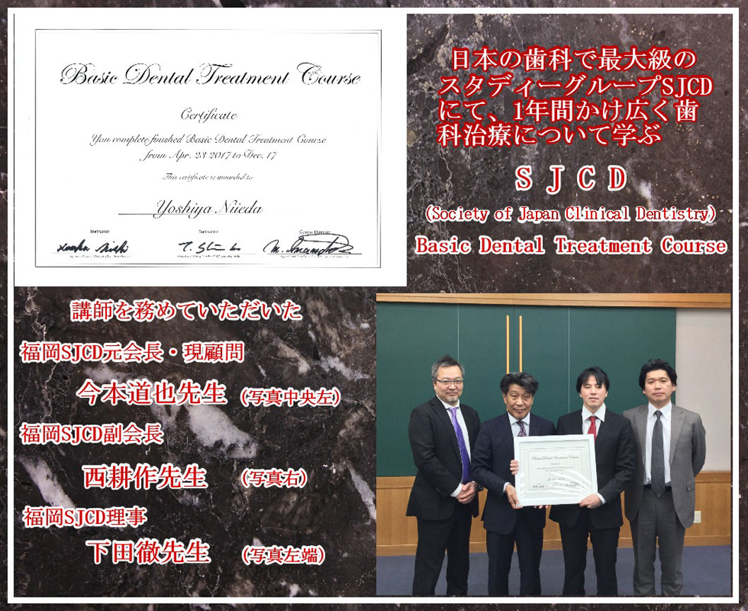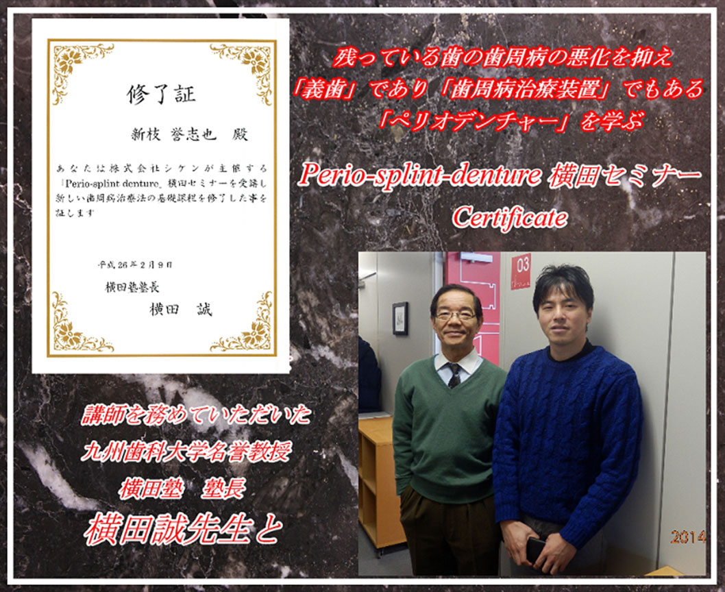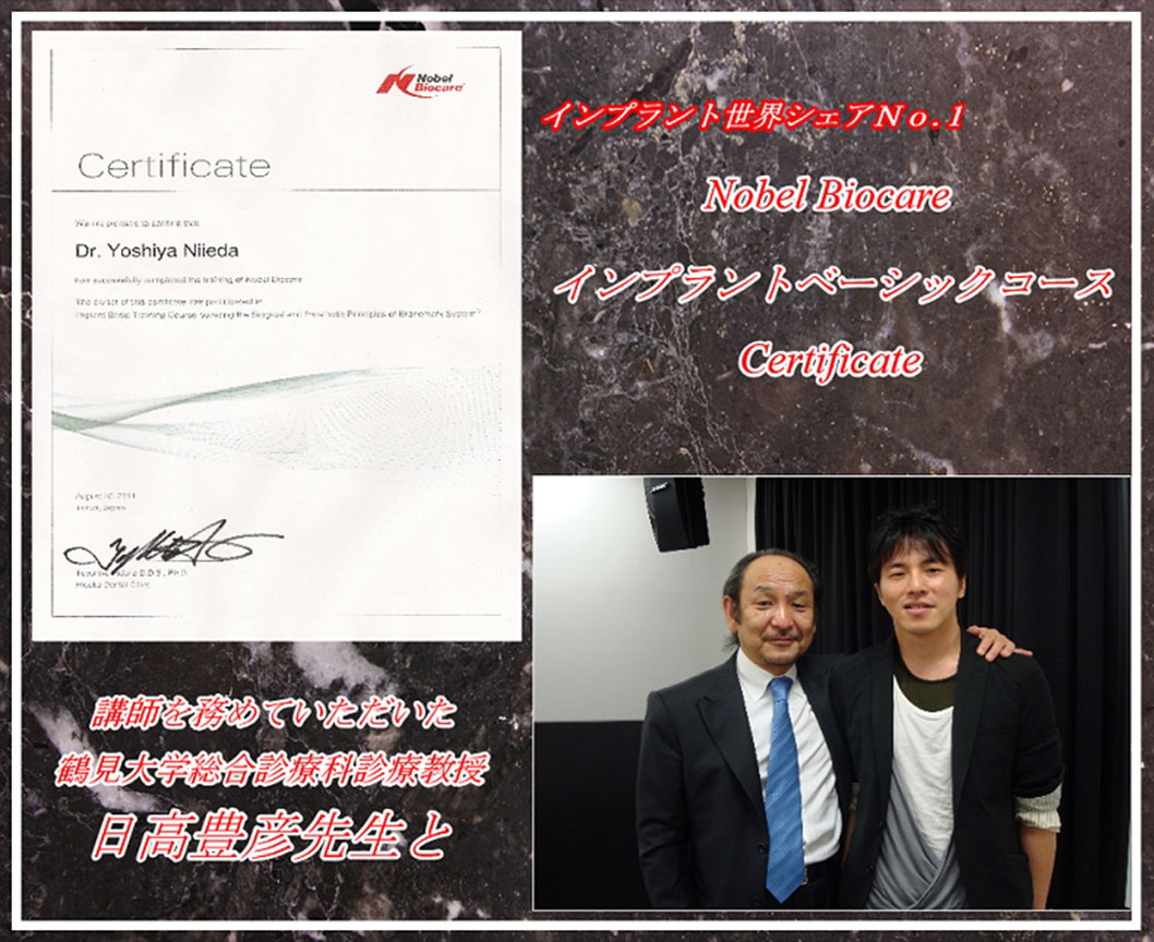 日本最大の歯科の学会、日本口腔インプラント学会にて、その技術、知識が評価され、「専修医」の資格を与えられました。